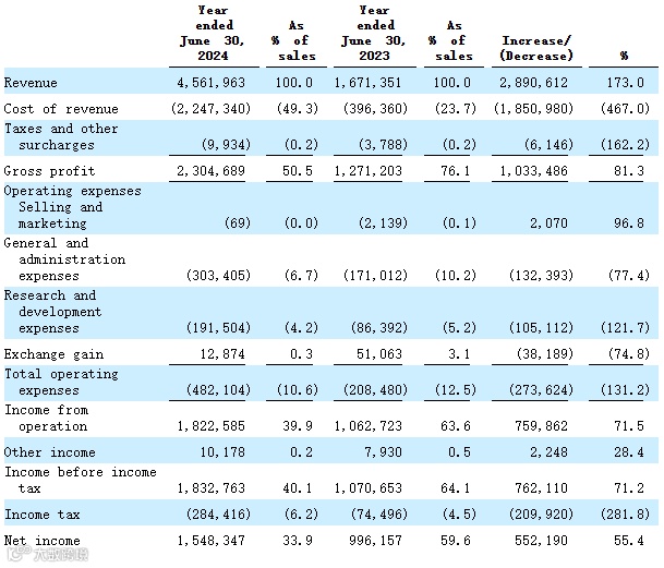 根据招股书披露的信息,在2024财年以及2023财年(该公司的财年结束日期为每年的6月30日),三易科技的营业收入分别达到了456.20万美元和167.14万美元。在净利润方面,2024财年实现净利润154.83万美元,而2023财年的净利润则为99.62万美元。