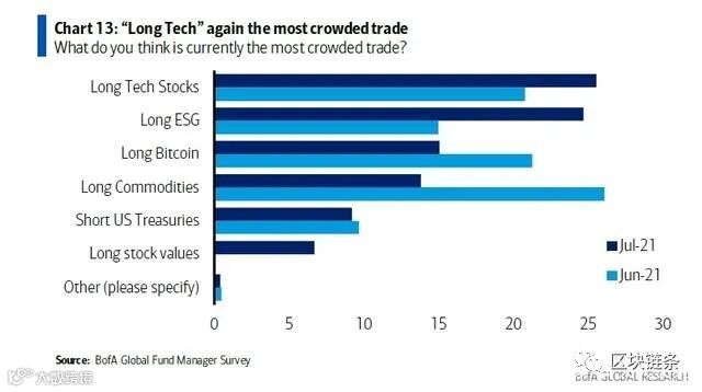 “做多比特币”是5月份最拥挤的交易,“做多科技股”排在第二位,其次是“做多ESG”。今年6月,“大宗商品多头交易”超过“比特币多头交易”,成为最热门的交易,令加密货币交易屈居第二。当时,“做多科技股”排名第三,“做多ESG”排名第四。
