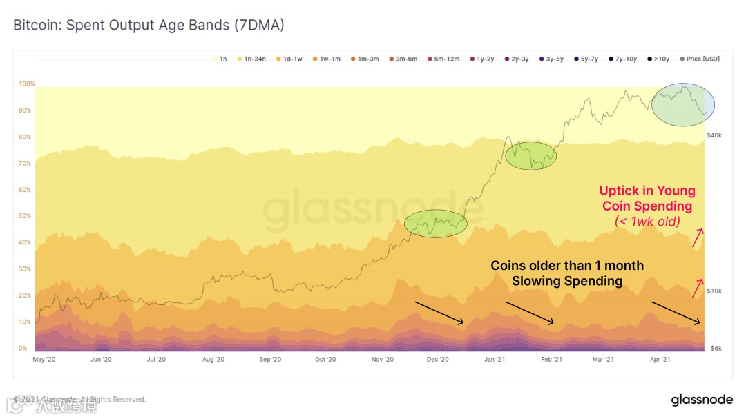值得注意的是,自2月份调整以来,6个月以上(紫色)的币支出并未出现明显增长。而类似的情况,我们可以在2020年12月突破2万美元关口之前,以及在1月份的第一次牛市调整期间观察到。