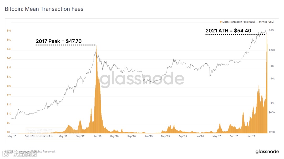 而对于用户来说,最直观的影响就是比特币平均交易手续费攀升至54.4美元的新高值。