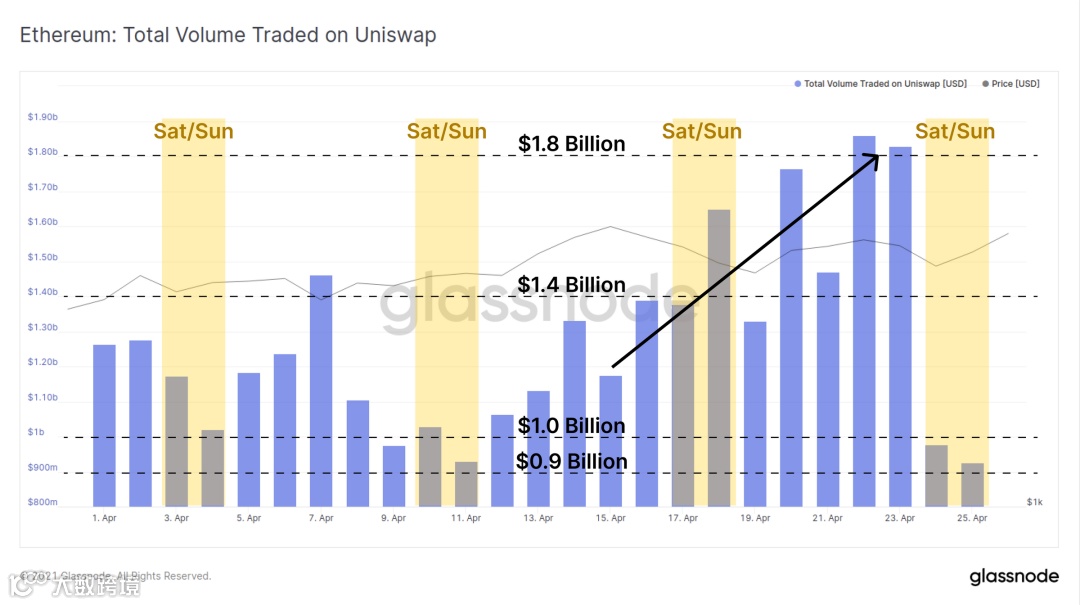 Uniswap的交易量在上周也继续走高,峰值日交易量达到了18亿美元。降低的gas费用以及价格调整显然为Uniswap交易者提供了新的机会。