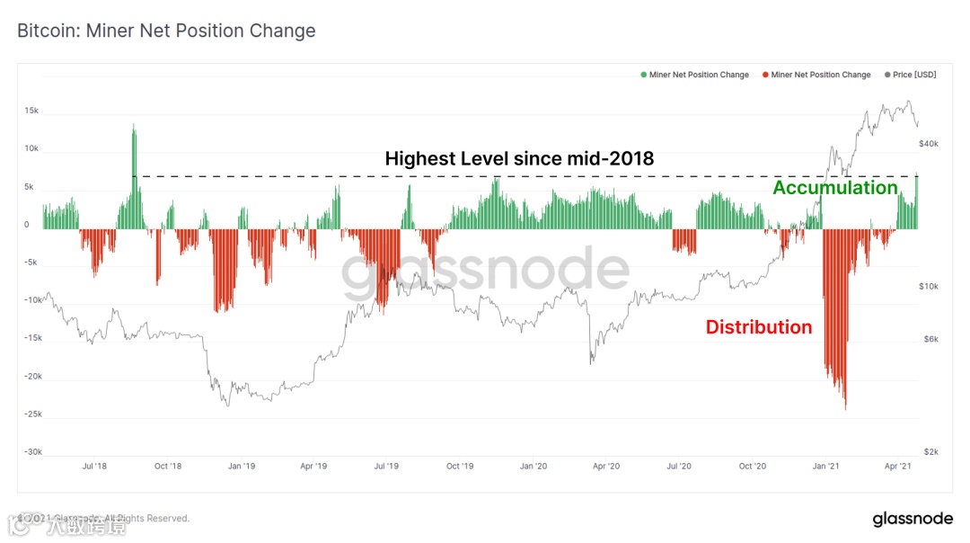 矿工们已回归累积模式,他们的净头寸变化达到2018年年中以来的最高水平。鉴于2020年减半事件之前的比特币发行量较高,这尤其令人印象深刻。这也可能反映了市场的成熟度,以及矿工在不通过抵押贷款和其他债务工具出售BTC的情况下,为其业务融资的机会有所增加。