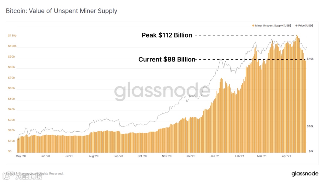 以美元计算,未花费的矿工币供应在这次价格调整前达到了历史最高水平的1120亿美元,目前这些BTC的价值约为880亿美元。