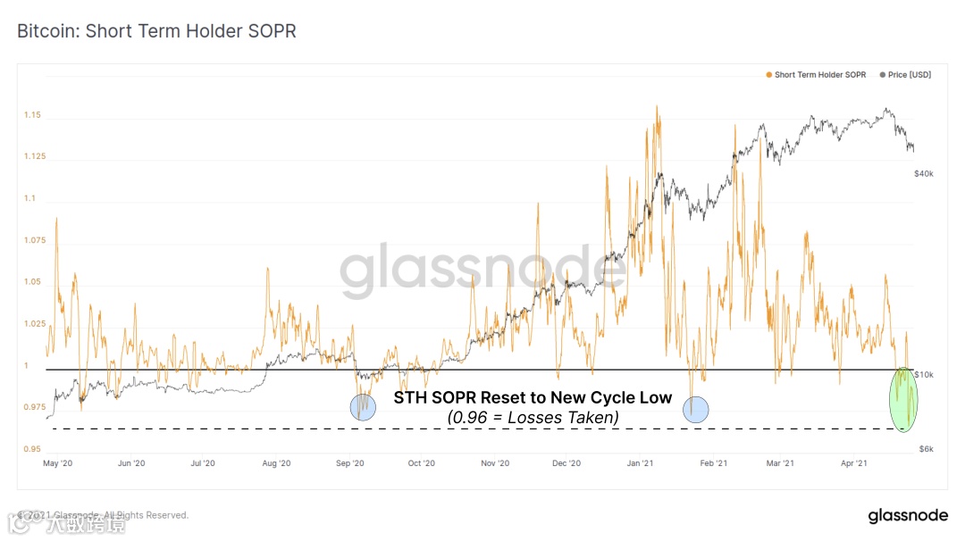 此外,短期持币者SOPR指标也已跌至本次牛市期间的最低值,这表明上周花费的币相对于上次移动时的价格而言总体处于亏损状态。这个指标提供了进一步的证据,表明以高价买入BTC的短期持币者在这次调整中已被震出了市场。从历史上看,SOPR指标的深度和长回撤对牛市的价格具有建设性意义,表明恐慌的卖家已精疲力尽,而币被转移到了更坚定的持有者手中。