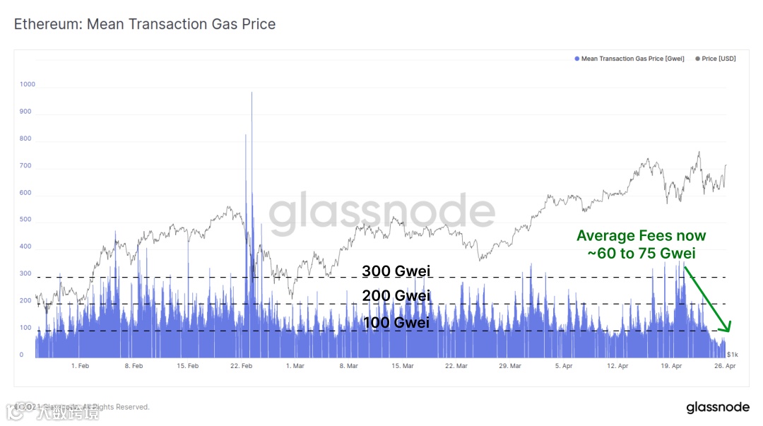 以太坊的交易费用在上周经历了大幅下降,目前,平均每笔交易的gas费用约为60-75 Gwei,这对用户而言是一件好事,降低费用的主要推动力是矿工将区块gas限制从1250万增加到1500万,从而有效地允许每个区块容纳更多的交易。