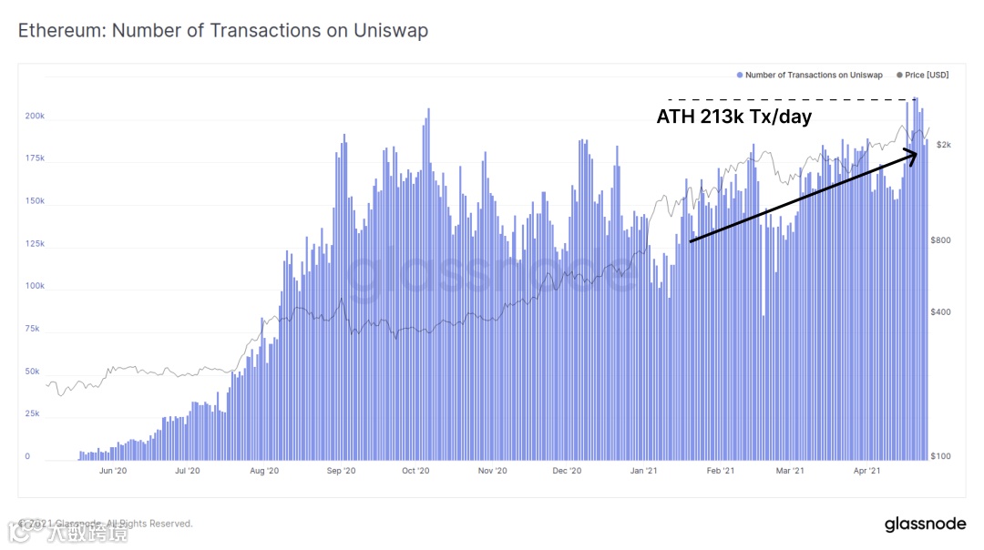Uniswap上的交易者显然对降低的gas费表示欢迎,上周该DEX的日均交易数量飙升至21.3万笔,创下了历史新高,这延续了2021年大部分时间以来的上升趋势。