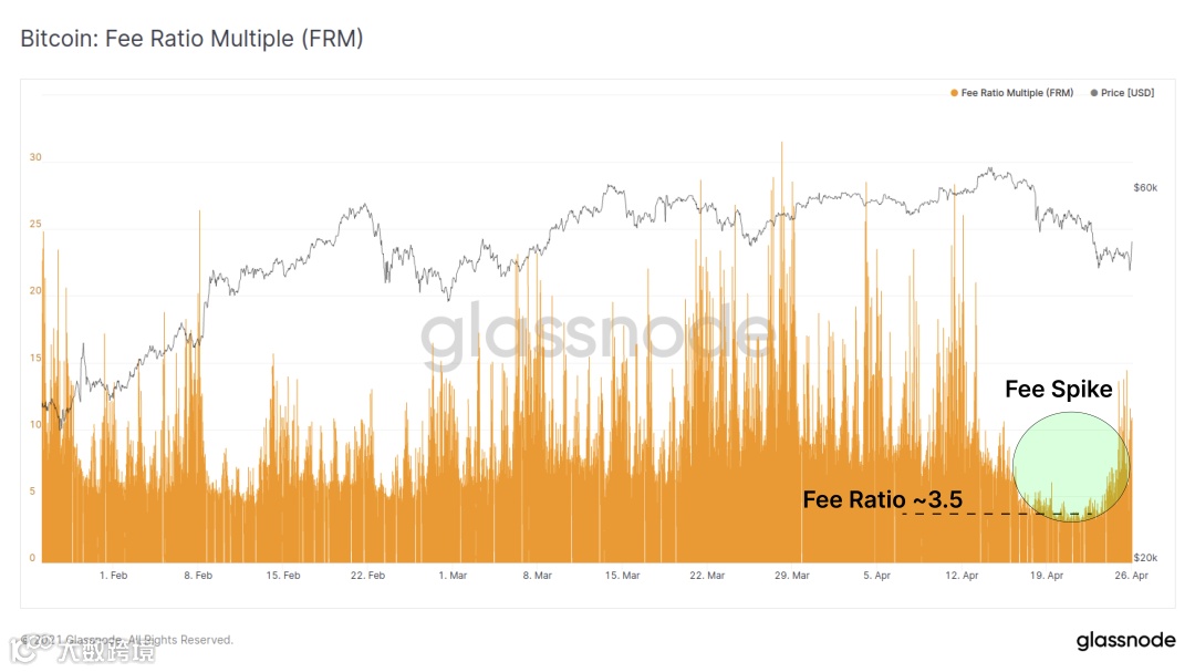 在整个牛市中,比特币费用比率倍数一直保持在7到8左右的水平,这表明费用占总区块奖励的12%至15%左右。