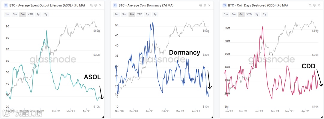 事实上,如果我们分析一些币龄指标,我们可以看到一贯的趋势,即旧币保持大量休眠状态,从而导致所有指标的下降趋势。下面的图表显示了三个不同的寿命指标,说明了这个有凝聚力的故事:
