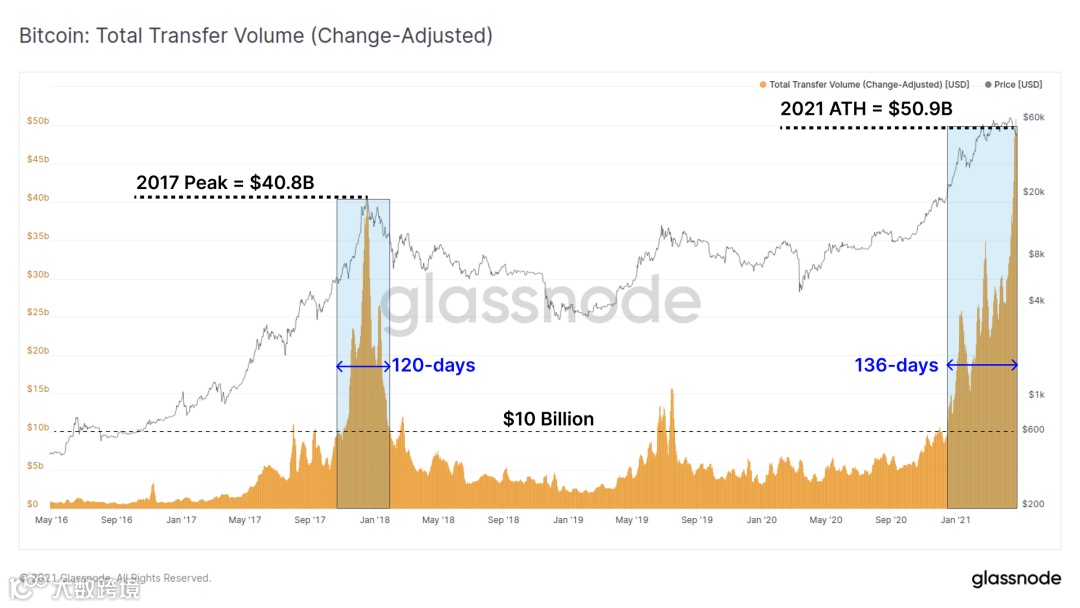 过去7日的日均转账值再创历史新高(日均结算额超过了509亿美元),较前高增长近25%。在过去的136天里,比特币网络每日的交易量始终超过100亿美元,这超过了2017年牛市中观察到的峰值持续时间。