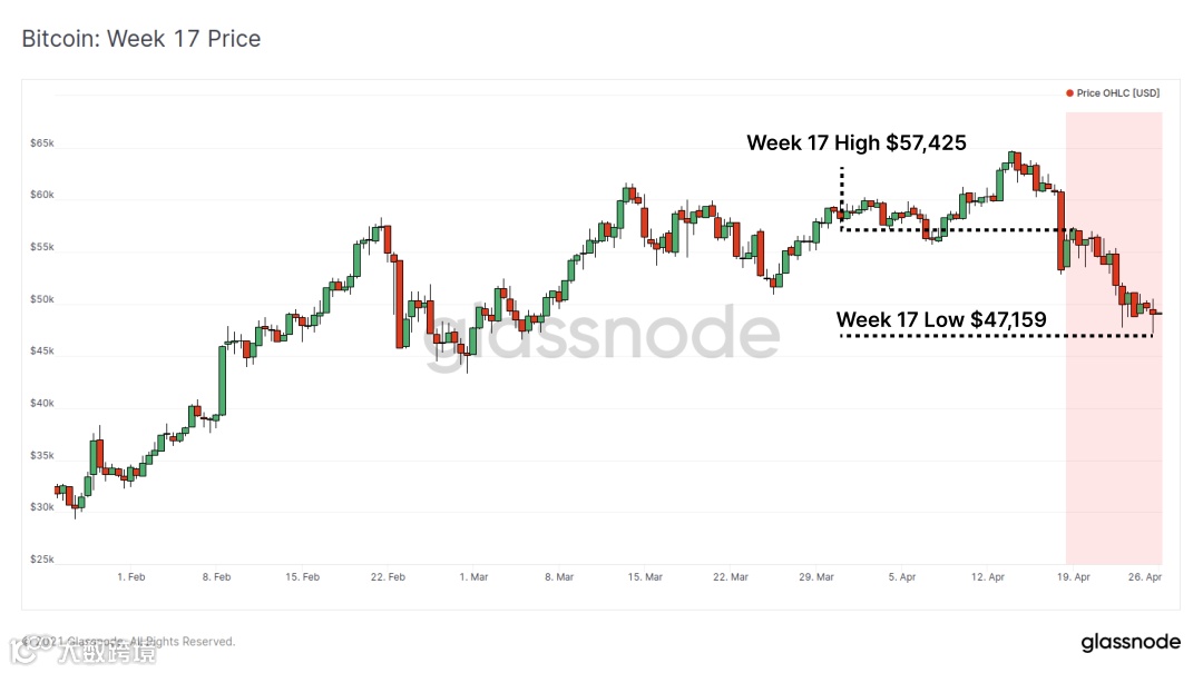 上周,比特币价格继续了下滑趋势,其从开盘价57425美元跌至低点47159美元。尽管比特币价格表现疲弱,但链上数据显示长期持币者仍在坚定持有,此外,矿工们开始了累积模式,而大部分的交易需求都来自短期持币者。