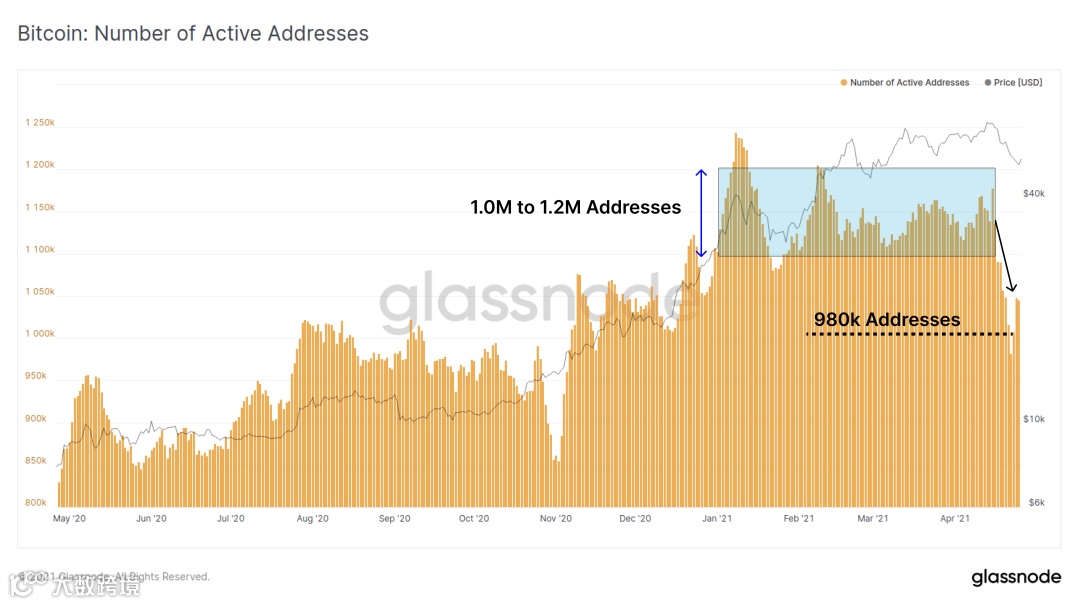 与此同时,上周比特币网络每日活跃地址数却下降了10%左右,从整个牛市的100万-120万地址范围下降到大约98万个地址。
