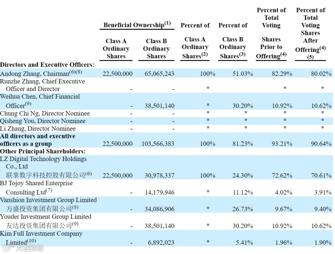 通过LZ Digital Technology Holdings Co., Ltd 联掌数字科技控股有限公司控制全部A类股份2,250万股、占A类股份的100.00%、占全部股份的15.00%,控制B类股份3,097.8337万股、占B类股份的24.30%、占全部股份的20.65%;通过Vanshion Investment Group Limited万盛投资集团有限公司*控制B类股份3,408.6906万股、占B类股份的26.73%、占全部股份的22.72%;合计持有和控制的股份占全部股份的58.38%、占所有投票权的82.29%;