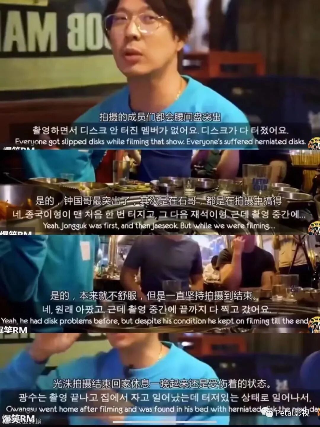 除了这次光洙车祸受伤外,其实RunningMan的所有成员身体都不怎么好。HAHA曾在节目上说Runningman的所有成员都有腰伤。