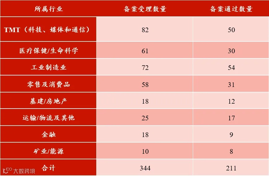 提交备案申请的企业覆盖了广泛的行业,主要包括科技、媒体和电信(TMT)、医疗保健和生命科学、工业制造、零售和消费品、基础设施和房地产、交通和物流以及其他服务行业,还包括金融业和能源领域。