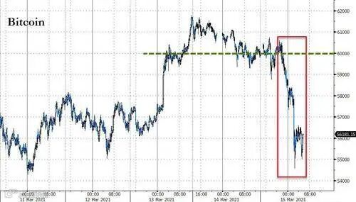 在比特币的带动下,市值排名第二的加密数字货币以太坊也在周末升至历史最高。不过周一亚洲时段午盘后,比特币快速跌破5.5万美元关口,较日高跌超5000美元,24小时内跌幅达9%。这拖累其他主流加密货币一道深跌。周一美股午盘前,比特币重回5.6万美元上方。