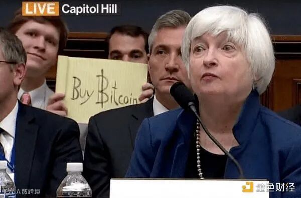 耶伦在加密货币行业一直很出名。因为她在2014至2018年担任美联储主席,曾经diss比特币,宣称自己不是比特币的粉丝。此外她还和加密货币圈的一个著名MEME“Bitcoin Sign Guy”联系在一起。2017年耶伦在国会参加听证会直播时,一个小伙在其背后举起一个“Buy Bitcoin”的牌子,并被实时直播给全世界。