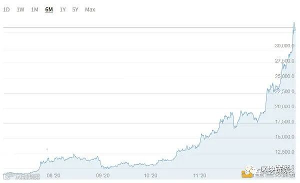 2021年1月2日,比特币史上首次突破30000美元,市值突破5500亿美元。