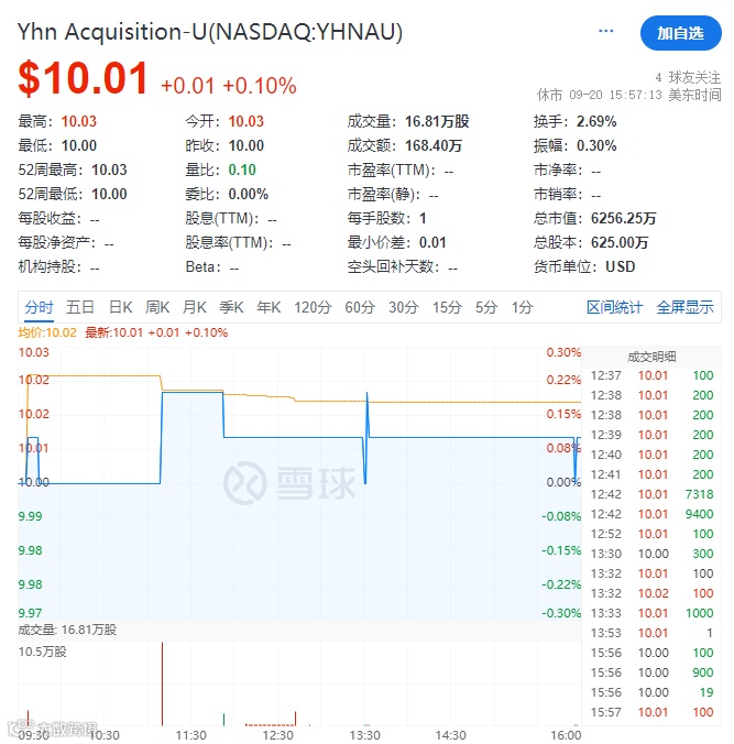 9 月 18 日,总部位于香港的 YHN Acquisition I 正式在纳斯达克亮相,股票代码为 YHNAU。这家公司以每股 10 美元的价格,发行了 600 万个单位,每个单位包括一股普通股和一种在最初的企业合并完成后获得十分之一股份的权利,此次 IPO 成功募资 6000 万美元。