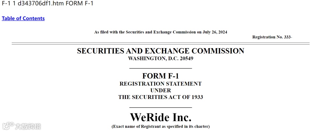 2024年9月25日,来自广州的专注于L4级自动驾驶技术公司WeRide Inc.(以下简称“文远知行”)向美国证券交易委员会(SEC)递交更新后的招股说明书,拟股票代码为“WRD”申请在美国纳斯达克IPO上市。 其早前于2023年2月23日在SEC秘密递表,后于2024年7月26日公开披露招股书。