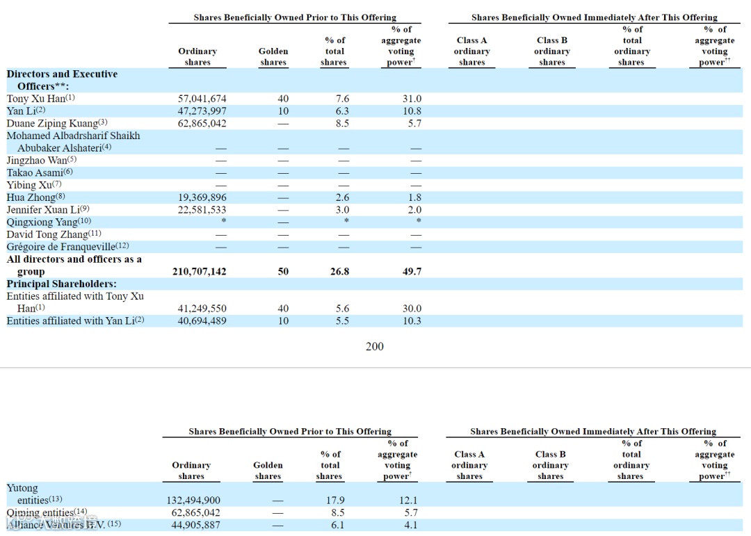 此外,Yutongentities(宇通集团)持股17.9%,有12.1%的投票权;Qiming entities(启明创投)持股8.5%,有5.7%投票权;Alliance Ventures持股6.1%,有4.1%投票权。