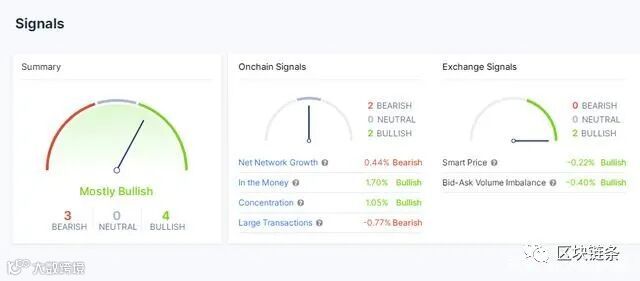 看跌信号是-0.44%的低“净网络增长率”。该指标使用新地址减去趋于零的地址来计算市场的真实增长。另一个看跌因素是“大宗交易”数量的下降(截至发稿时为下降0.77%),这意味着过去一天超过10万美元的链上交易数量减少。然而,大多数链上数据都是乐观的。