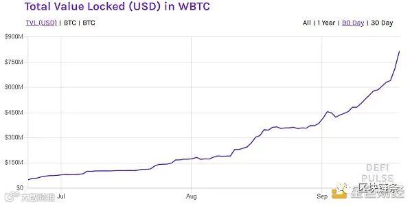 WBTC (Wrapped Bitcoin)是以太坊上的代币化比特币,于2019年1月推出,在去中心化金融收益耕作爆发之前,WBTC增长相对缓慢,但现在其固定价值已经超过8亿美元,自八月以来上涨了近5亿美元。