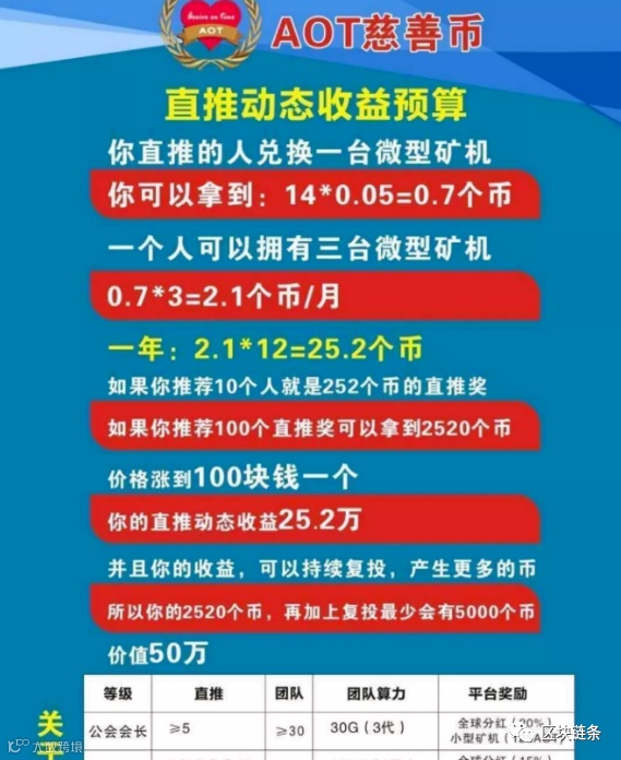 套路2、虚拟的云矿机!挖矿收获高额的收益,千万富豪不是梦!用户注册完之后,后面相当简单了,运行矿机等着收币就行,系统赠送的矿机总产量是11个币,而三天可以产一个币,11个币又能买一台矿机。其实慈善币币完全由系统凭空产生,与挖矿无关。发行自己的空气币,然后让你花钱买空气矿机去挖!操盘方资料显示,AOT总发行量10亿枚,将全部通过矿机挖矿获得,AOT每两年对半减产。第一个两年5亿,第二个两年2.5亿,第三个两年1.25亿,以此类推,所有AOT共用40年挖完。