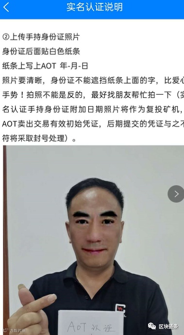 套路1、严格的进入资格,留下忠实的韭菜!元和在网上找到了一个注册链接,通过平台了解到,注册需要需要提供身份证照片和手持照片,而且还是严格的手持身份证和写着AOT认证和日期,而且了解到认证通过时间很长,限制用户注册量。典型的饥饿传销方式,让你感觉他们的项目很火爆,不是随便就能参与的。