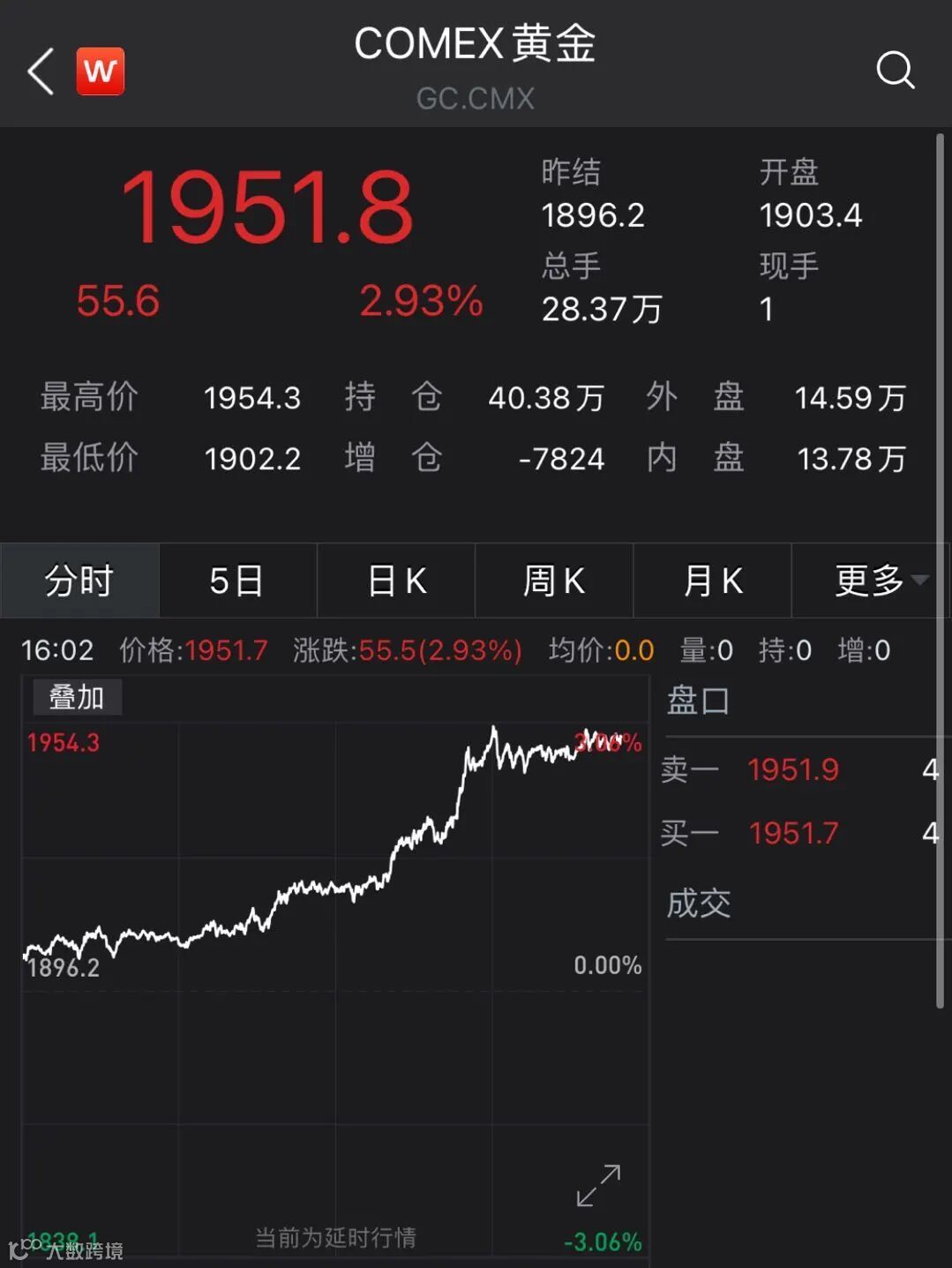 黄金期货已站上1950美元/盎司关口。