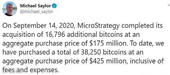 8月,MicroStrategy称其购买了2.5亿美元比特币,9月份,该公司CEO表示MicroStrategy又投资了比特币1.75亿美元。