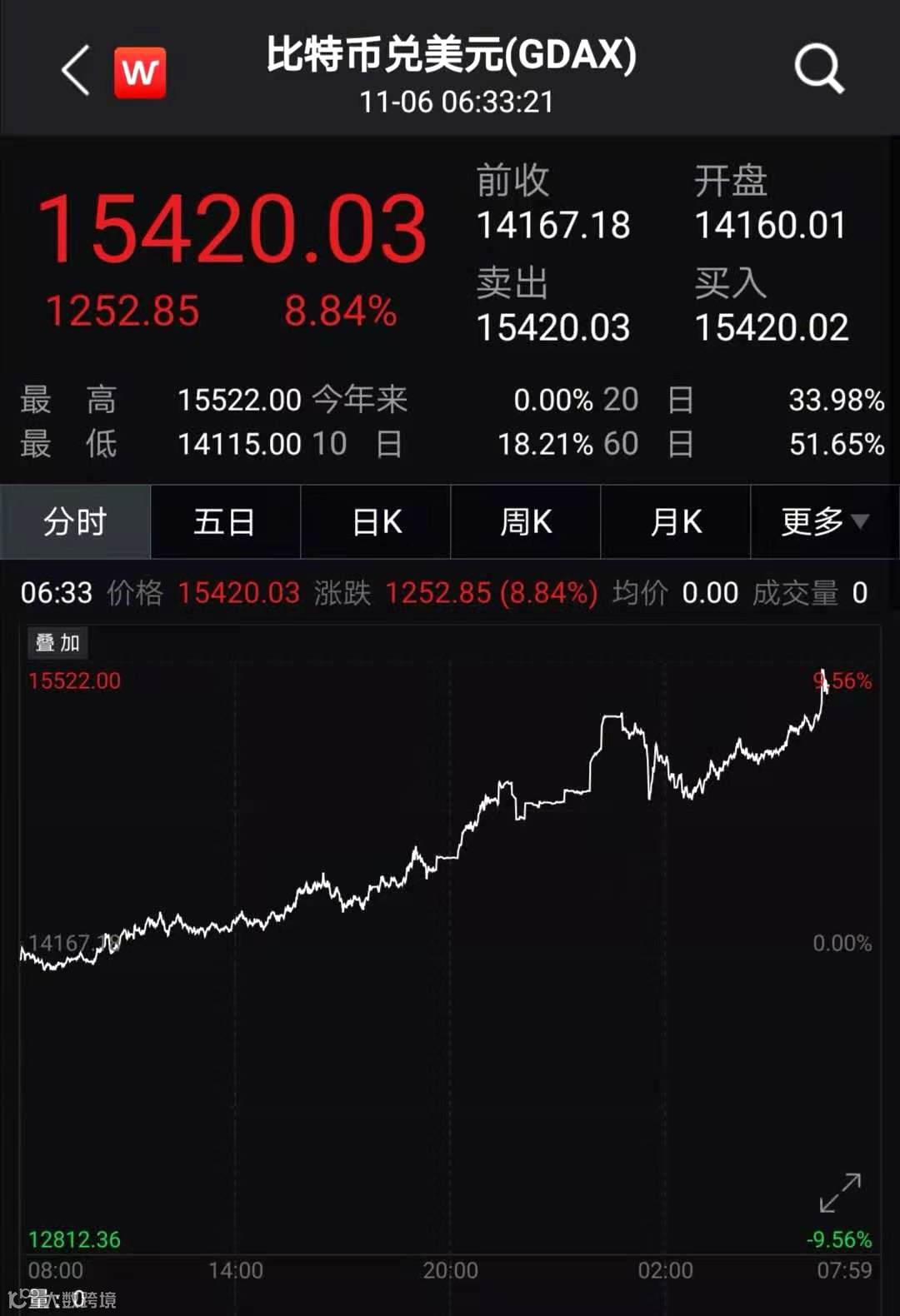 11月5日,比特币也强势拉升,日内一度上涨一千多美元,突破15000美元,为2018年1月以来最高水平。