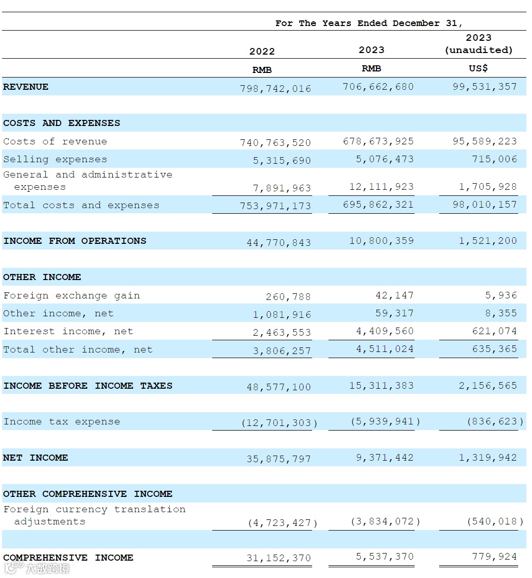 招股书显示,智慧物流环球公司2022年、2023年营收分别为7.99亿元、7.07亿元人民币;运营利润分别为4477万元、1080万元人民币;净利分别为3588万元、937万元人民币。