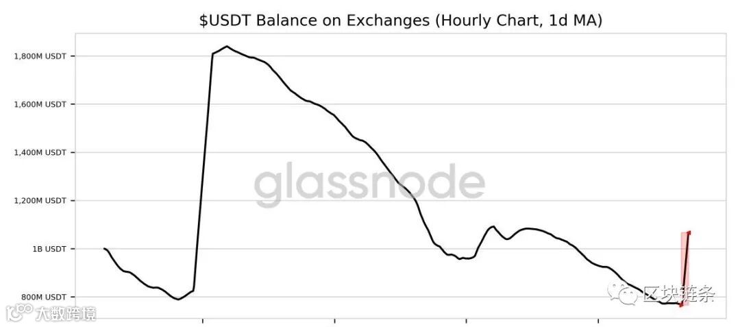 消息面上,链上分析公司Glassnode数据显示,在交易所当中的USDT余额在最近24小时内增加3亿,达到10.6亿USDT,涨幅为39.3%。
