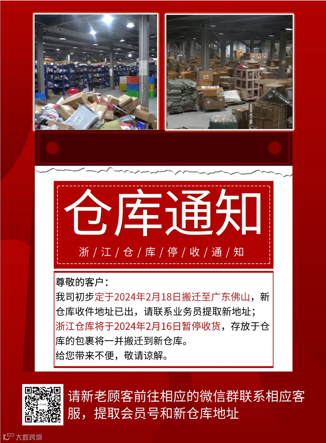 我司初步定于2024年2月18日搬迁至广东佛山,新仓库收件地址已出,请联系业务员提取新地址,浙江仓库将于2024年2月16日暂停收货,存放于仓库的包裹将一并搬迁到新仓库。给您带来不便,敬请谅解。