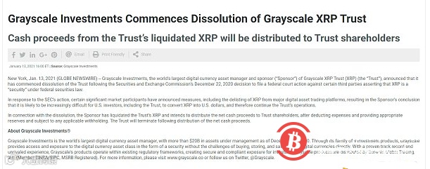 灰度此次终止XRP信托,在美国SEC对XRP诉讼之后就有迹象。2020年12月3日,灰度投资宣布,自2021年1月15日(美国东部时间)下午5点起暂停XRP交易,将XRP从基金的投资组合中删除,并出售持有的XRP资产。