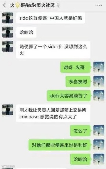 甚至还说国人就是好骗,随便弄了个SIDC币,没想到搞得这么火。甚至还吹牛说,自己的币要上coinbase,散户在他们眼里就是傻逼。