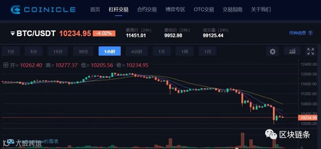 区块链达人Coinicle行情显示,比特币(BTC)周四晚间随美股大跌,从11,249暴跌千点以上,最低下探9,952.98美元,累计跌幅达11%。其余主流币方面,以太坊从430高点下挫,最低下探372美元附近,累计跌幅达13%。