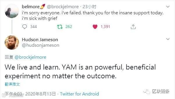 香港时间8月13日下午4时,Yam Finanace的创始人Belmore在推特上表示:“我对不起大家。我失败了。谢谢你们今天的疯狂支持。我非常悲伤。”