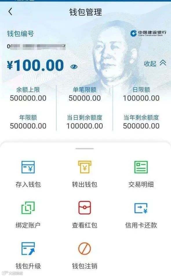 开通后钱包管理页面显示,用户可以直接通过建行账户将资金充入钱包。