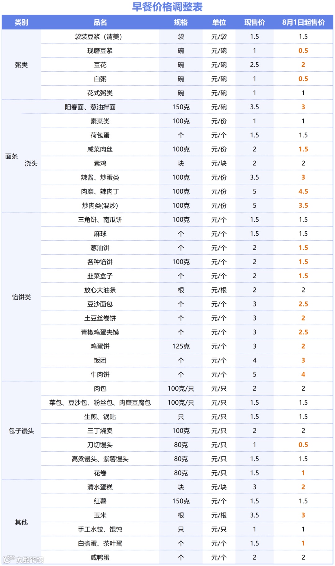 。这次调整后,绝大多数早餐品种价格有所下降: