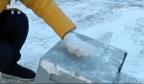 据预告,塔河县最近几天最低气温将达零下45-47摄氏度。零下四十多度到底有多冷呢?现在,我们把手套喷湿,放在铁皮上,看看会发生什么。大家可以看一下,现在手套已经冻在了铁皮上,并且冻得很牢固,已经可以把一公斤重的铁皮提起来了。