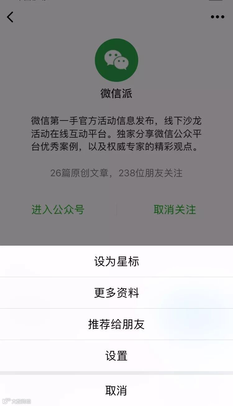 ⊙"置顶”变为“星标”。用户此前置顶的订阅号名称前出现“星标”,“星标”订阅号消息同样按照时间排序,不再置于最顶部位置。同时,在微信聊天主界面的订阅号列表盒子和进入后的订阅号消息列表里,都会以星标提示阅读。用户可以继续把订阅号设为星标。