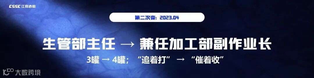 我的第1次岗位改变发生在2023年春节后。当时VLGC开始在船坞双线建造,意味着江南重工每月需完成4只分段,才能保障船坞需求。部门更是打出开局即是决战的口号,春节后我就被部门从作业区调至生管部任主任,原本我以为这只是一次平平无奇的调动,到任后我才发现事情没有那么简单,科室原本3名科级干部在同时被调至各作业区充实力量,我被“一换三”了。还好管理室相关业务我从事多年,在短暂调整后,很快进入了状态。