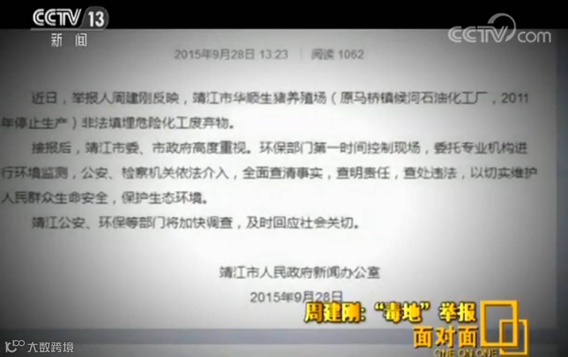 拿到养猪场埋藏危险废物的确凿证据之后,周建刚最早想到的是寻求媒体的帮助,于是他找到了当地一些媒体反映情况。