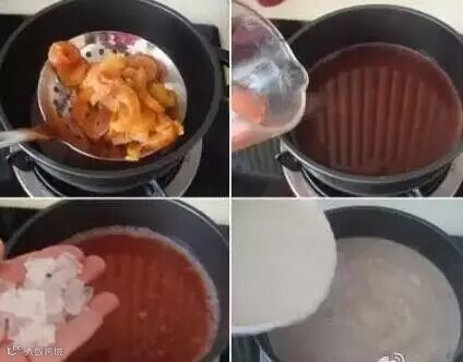 2、锅内加油炒至4成热,放入冰糖。小火炒至冰糖融化,锅中的冰糖浆会出现大气泡,过一会大气泡变成小而密的气泡,能闻到熬糖的香味。立即倒入10ml清水。