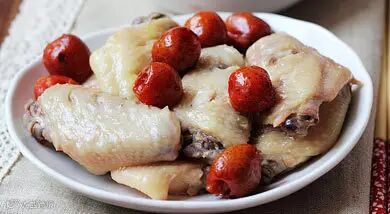 3、腌制好的鸡翅择去葱姜,将糖水山楂均匀撒在鸡翅上,旺火上锅蒸20分钟,关火焖10分钟即可拿出,冷热均可食用。