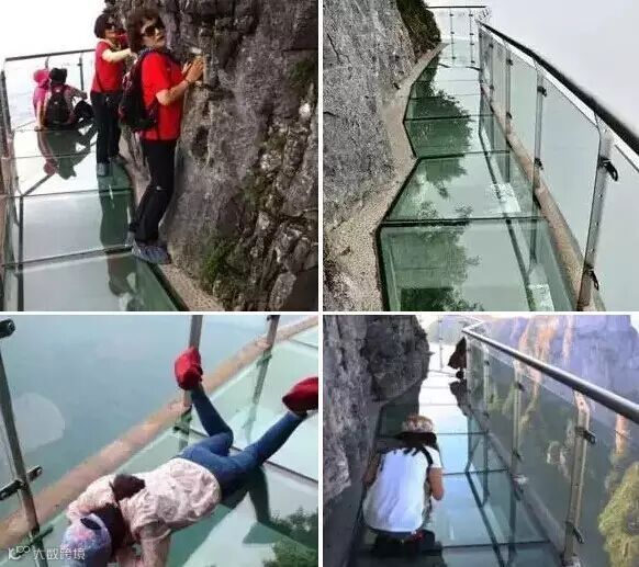 胆子够大的在栈道上随意拍着美照,胆子小的姿势可就花式的多了。全程扶墙走的有,直接吓得腿软的也不少。