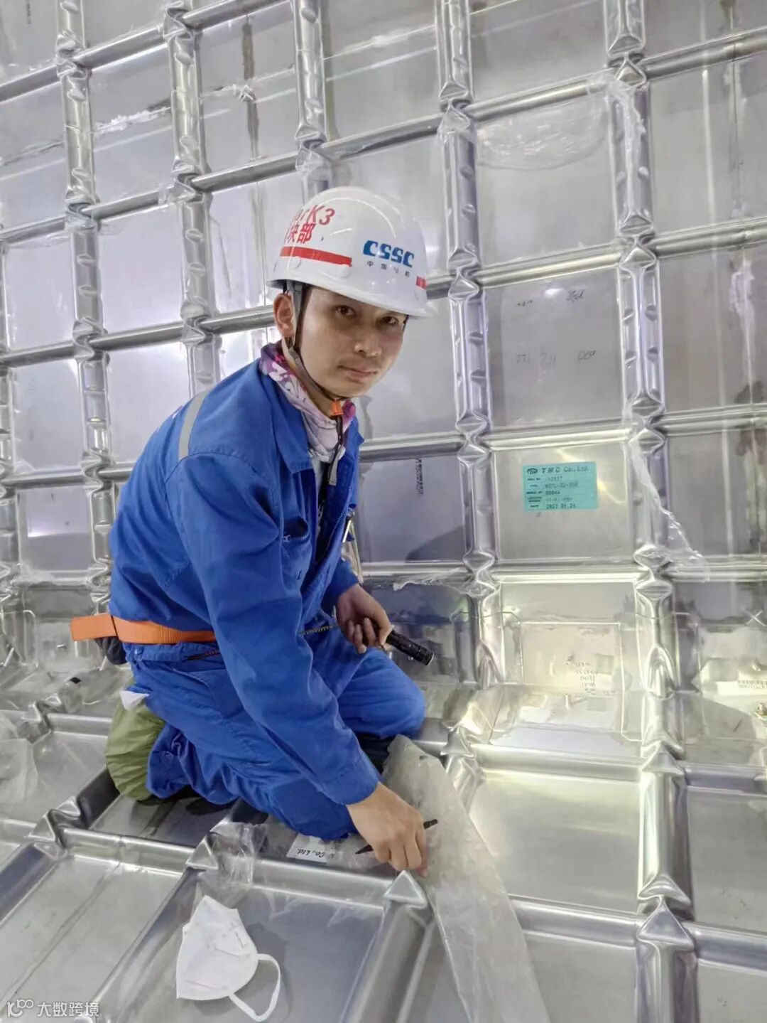大家可能不太清楚零漏点是个什么概念,MARK III的燃料舱,接近七八层楼高,交验要求非常严格,所焊接的每一条焊缝都需要百分之百检测,还需要做2遍,20多个检测人员做2遍检测需要整整一周时间。国外服务商做的23000箱的第一个燃料舱,检测是8个漏点,最后一艘也检测出了2个漏点。我带着班组一起努力,MARK III的技术,我们不比国外差。我们班组也获得了全国质量信得过班组称号。