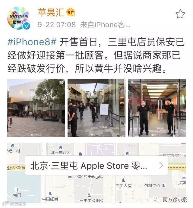 今早7点左右,三里屯苹果店门口是这样的……据报道,这稀稀拉拉的“人群”里,还有一部分是参与报道的媒体。