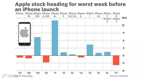 据MarketWatch报道,iPhone 8发布之后,苹果股价持续走低。在周三下跌1.68%之后,周四继再跌1.7%。
